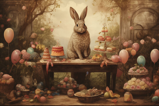 A charming vintage illustration of a rabbit graces the table, bringing a touch of nostalgia to the Easter party