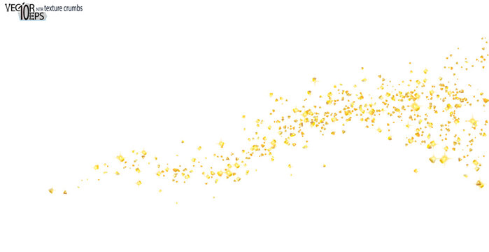 Wavy strip sprinkled with crumbs golden horizontal texture. Background Gold dust on a white background. Sand particles grain or sand. Vector backdrop golden path pieces grunge for design illustration.