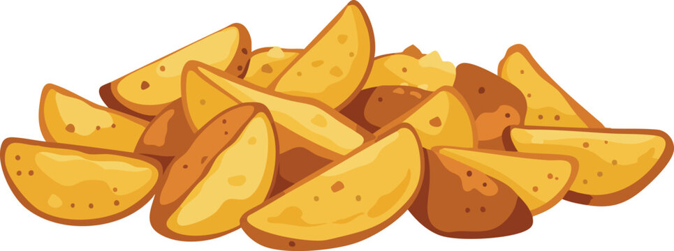 A delicious pile of golden brown fried potato wedges shown in a cartoon vector style, isolated on a white background.