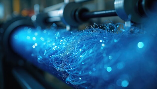 Blue fiber optic threads are spun onto a large spool in a manufacturing plant. This industrial process creates fine threads used in tech. It shows production.