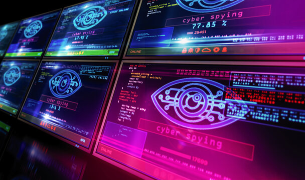 Cyber spying hacking and supervise eye symbol on screen illustration