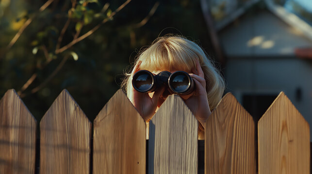 A curious woman spying on her neighbors using binoculars, embodying neighborhood voyeurism.