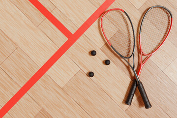 Squash player on a squash court with racket. Man athlete with racket on court with neon colors. Sport concept. Download a high quality photo for the design of a sports app or betting site.