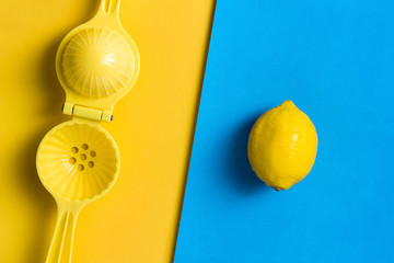 Lemon and juicer, squeezer on contrasting colored background.