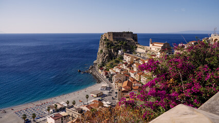 Panoramic view of Scilla, characteristic village of Calabria, with its beach, the Ruffo Castle and the Ionian Sea