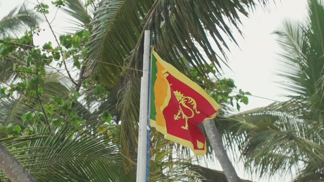 Sri Lankan flag flying near palm trees in a tropical setting, showcasing vibrant colors
