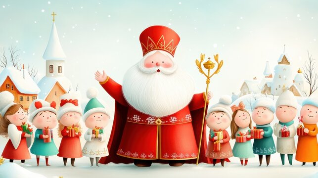 St. Nicholas stands joyfully in a snowy village, surrounded by smiling children eagerly receiving gifts, capturing the warmth and spirit of St. Nicholas Day.