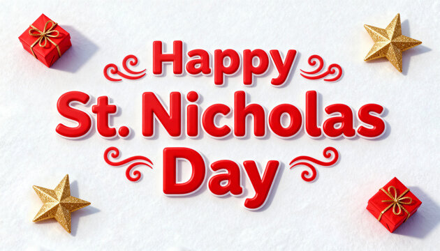 Happy St. Nicholas Day greeting card with colorful festive lettering on a snowy background, surrounded by gift boxes and golden decorative stars. Winter celebration and Christmas season design concept