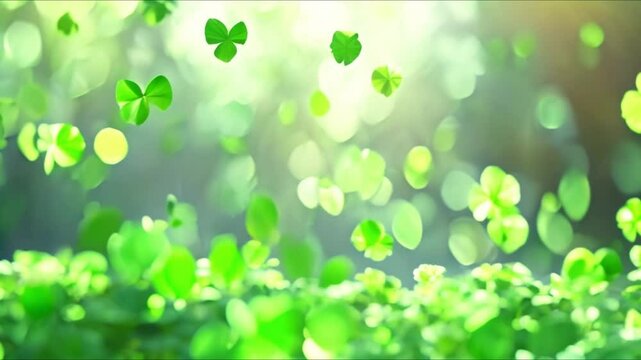 Flying Clover Leaves: St Patrick's Day Background with Greetings. Concept St Patrick's Day, Clover Leaves, Greetings, Background, Green Colors