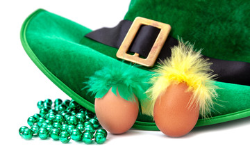 St Patrick's day costume hat leprechaun green white chicken egg green yellow feathers isoiated hair