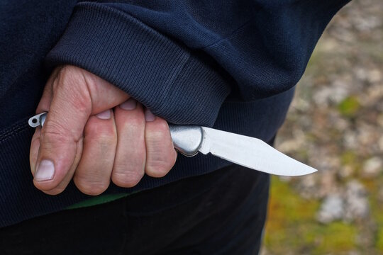 hand of a male criminal in blue clothes and a gray knife behind his back on the street