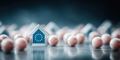 Silver emblematic house rests among pink spheres, representing European realestate bubble.