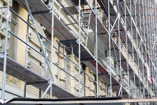 Tall building under construction with scaffolds. Scaffold. Construction Scaffoldings
