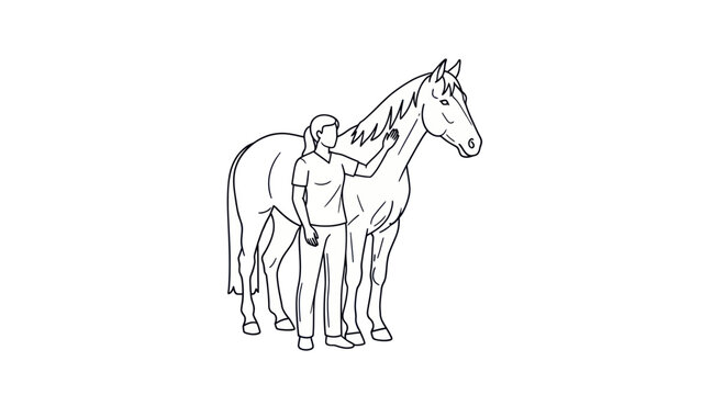 Woman wearing riding harness, adjusts horse's bridle in indoor arena, caring for beloved pet. Rider strokes horse with hand, owner taking care of animal. Concept: equestrian sport, riding school