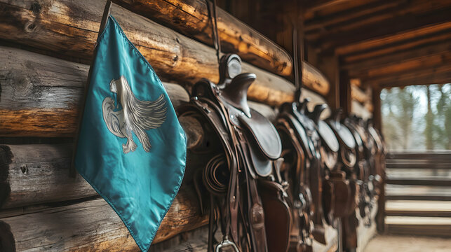 A rustic barn interior with golden sun filtering through wooden slats, harvest tools, natural textures
