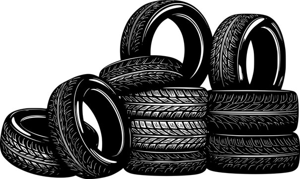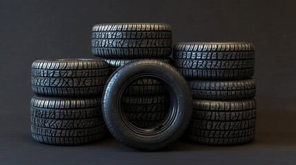 A stack of sturdy, reliable new car tires ready for the open road, showcasing deep tread and a robust design against a bright white background.