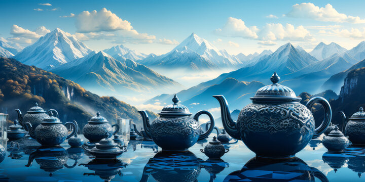 Breathtaking digital creation of mountains made from stacked teapots, showcasing surreal repetition and fantastic light play.