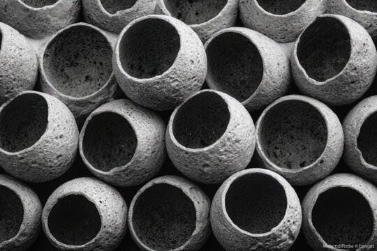 A pile of round brown objects with textured surfaces stacked on a light beige background in soft lighting