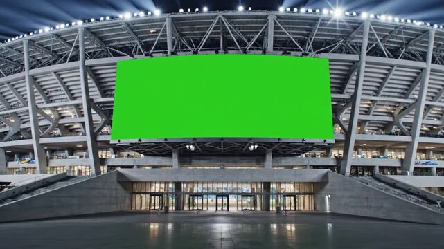 Massive greenscreen billboard on modern illuminated stadium exterior creating versatile advertising space in large outdoor arena setting