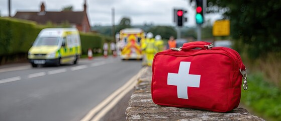 Emergency medical response team attending an accident scene with a first aid kit positioned along the roadside