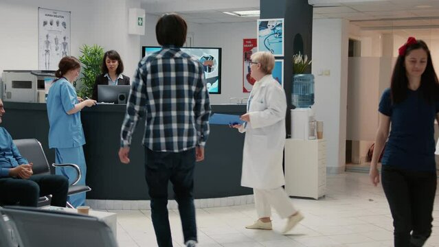 Impatient group of people asking to write healthcare report and waiting in busy hospital reception lobby. Being in medical clinic waiting area to attend consultation appointment. Handheld shot.