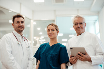 Smiling medical team in blue scrubs conveying trust and teamwork