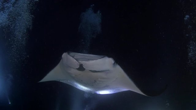 Close Up: Large Manta Ray Swimming In Dark Water With Lights And Scuba divers in Big Island, Hawaii