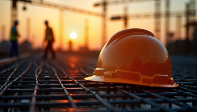 Construction site at sunset. Workers are on site. Hard hat is on metal rebar. Early construction stages. Golden hour light. Labor Day. Foundation work. Building under construction.