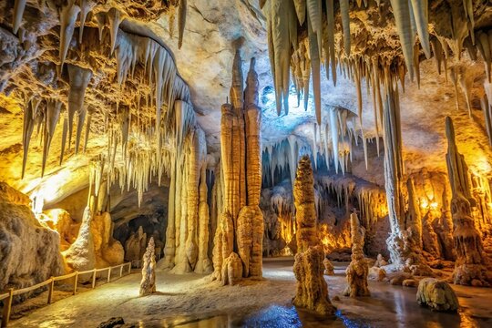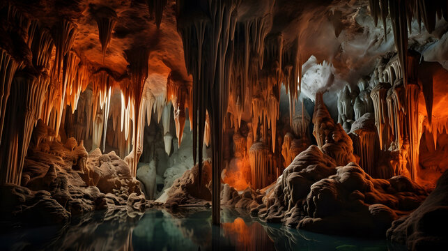 Discover a dark and mysterious cave. Explore the passages, with stalagmites and stalactites, for a feeling of ancestral spirituality. Generative AI