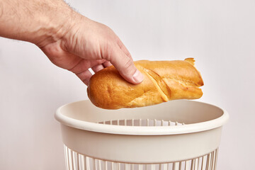 A piece of stale bread is thrown into the trash. Disposal and recycling of food waste.