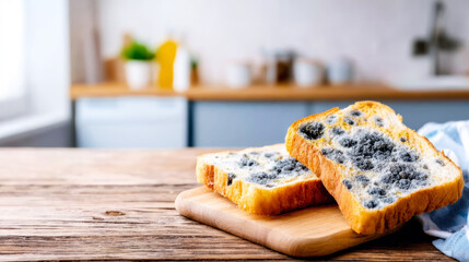 The bread slices are covered in green and black mold, highlighting the presence of food spoilage, contamination, decay, and potential health hazards