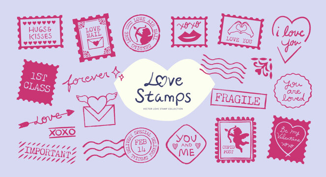Set of hand-drawn Valentine's love postage stamps for cards, gift tags, invitations, scrapbooking, and romantic packaging with vintage purple charm