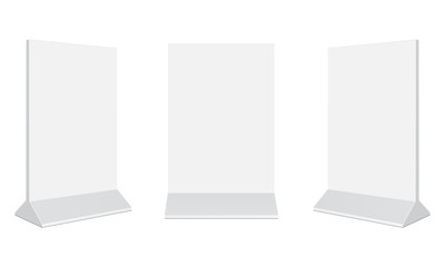 Set of outdoor advertising stand banners. Blank vertical poster isolated on white background. Display your design on this mockups in different positions. Vector illustration