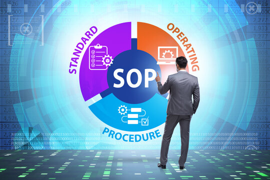 SOP, Standard Operating Procedure concept. Businessman holding virtual SOP icon for standard operating procedure, process, operation, quality, workflow, iteration, and puzzle.
