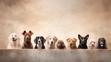 Banner with many dogs of different breeds standing in line and looking at the camera. Free space for advertising texts. Template for veterinary, dog food, dog grooming. Light background Generative ai