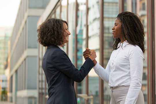 Happy proud colleagues enjoying team success. Business women giving friendly handshake outside. Triumph or celebration concept