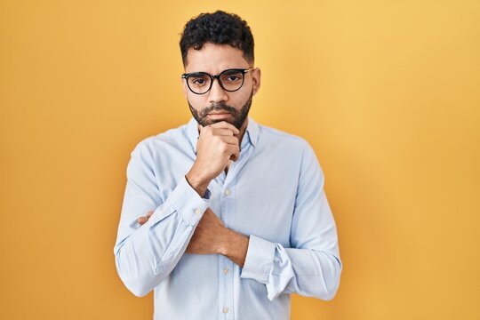 Hispanic man with beard standing over yellow background looking confident at the camera with smile with crossed arms and hand raised on chin. thinking positive.