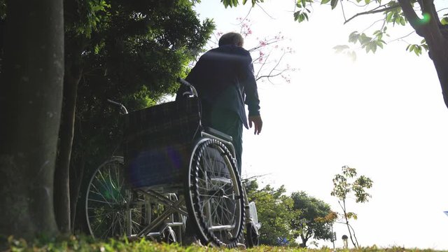 slow motion of unwell asian elderly male with knee pain standing up slowly with a stick from the sofa at home. female nursing aide giving support while the man groans painfully
