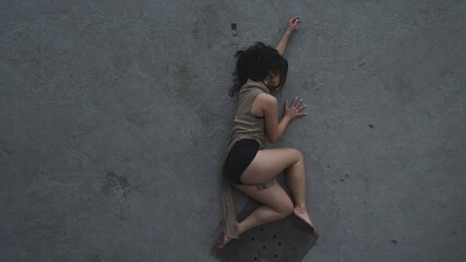 Dancer asleep on concrete floor in industrial warehouse opening eyes looking into camera and standing up beginning to dance