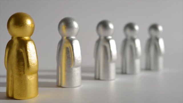 A golden figurine stands apart from a line of identical silver figurines against a neutral background.
