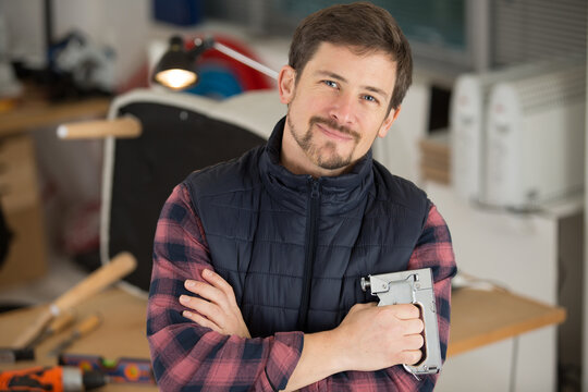 male upholsterer holding a staple gun