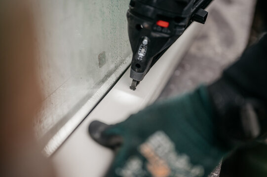 Person wearing safety gloves with staple gun attaching window frame.