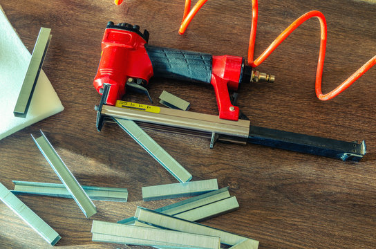 Staples, for a pneumatic stapler, in a carpentry workshop