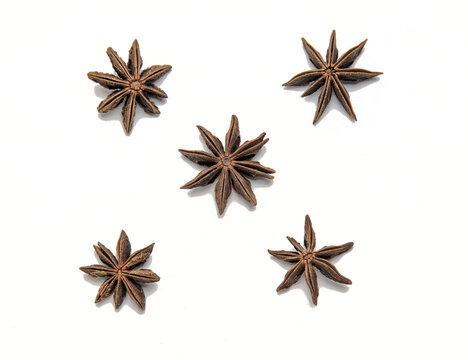 star anise arranged in square shape close up isolated on a white background (spices for cooking cut out) indian cuisine (licorice flavoring seed) curry ingredient