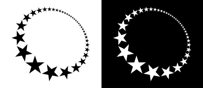 Stars of various sizes arranged in a circle. Round frame, border. Black star shape, simple symbol. Design element, ornament. Vector illustration