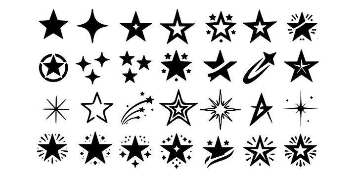 Black star shapes vector collection, unique designs for logos, badges, emblems. Includes classic, shooting, glowing stars. Perfect star icon for patterns, celestial themes, night sky illustrations