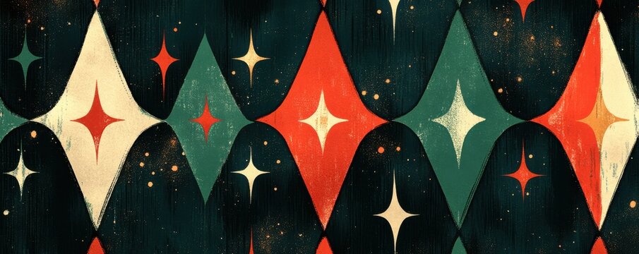 Seamless pattern of vintage inspired red and green diamond shapes with star motifs