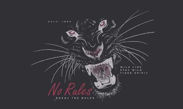 Tiger face vector artwork for t shirt and others. Breck the rules. No rules. Rock and roll graphic print design for apparel, stickers, posters and background. Rock star design.