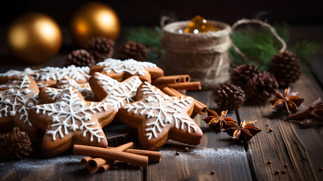 Gingerbread star shaped cookies with cinnamon and cardiac on a wooden table. Christmas holiday food