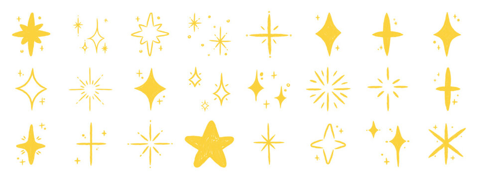 Pastel crayon star shapes. Childish doodle stars and spark elements with soft brush texture. Kids sketch vector collection.